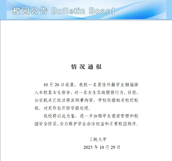 10月29日,三峡大学发布情况通报:10月26日凌晨,我校一名男性外籍学生翻墙潜入本校某女生宿舍,对一名女生实施猥亵行为。目前,公安机关已依法将其刑事拘留,学校依据相关校纪校规,对其作出开除学籍处理。