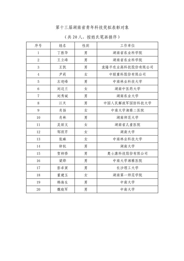 关于第十三届湖南省青年科技奖拟表彰对象的公示