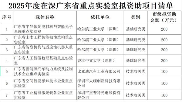 根据《深圳市重点实验室管理办法》等有关规定,市科技创新局拟对2025年度在深广东省重点实验室共7个项目进行资助,现予公示,向社会征求意见。