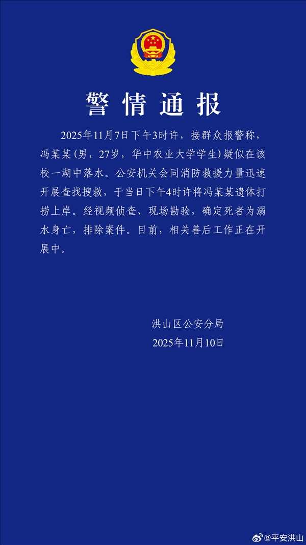 11月10日,武汉市洪山区公安分局通过微博“平安洪山”发布警情通报,内容如下:2025年11月7日下午3时许,接群众报警称,冯某某(男,27岁,华中农业大学学生)疑似在该校一湖中落水。公安机关会同消防救援力量迅速开展查找搜救,于当日下午4时许将冯某某遗体打捞上岸。经视频侦查、现场勘验,确定死者为溺水身亡,排除案件。目前,相关善后工作正在开展中。
