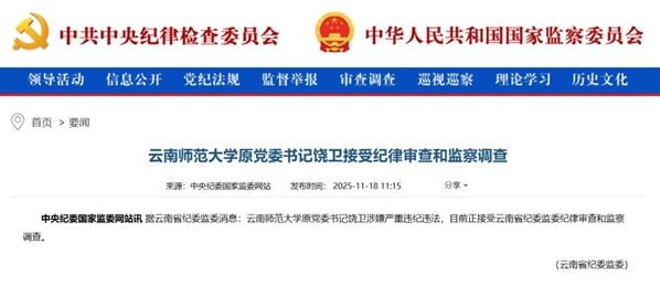11月18日,云南省纪委监委网站发布消息:云南师范大学党委原书记饶卫涉嫌严重违纪违法,目前正接受云南省纪委监委纪律审查和监察调查。