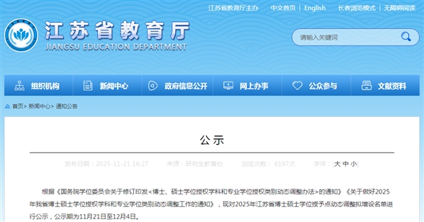 根据《国务院学位委员会关于修订印发<博士、硕士学位授权学科和专业学位授权类别动态调整办法>的通知》《关于做好2025年我省博士硕士学位授权学科和专业学位类别动态调整工作的通知》,现对2025年江苏省博士硕士学位授予点动态调整拟增设名单进行公示,公示期为11月21日至12月4日。