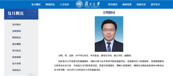 复旦大学官网更新现任领导介绍显示,方明已任复旦大学党委副书记。