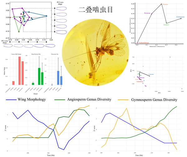 昆虫是地球上最早掌握动力飞行的动物,其翅的演化是它们成功征服天空的关键。然而,全球性的灾难事件如何影响这种精细的演化过程?是推动创新,还是设置障碍?为了回答这个问题,中国科学院动物研究所白明研究员团队将目光投向了一种跨越石炭纪至白垩纪的古老昆虫——Permopsocida二叠啮虫目,这类昆虫生存时间恰好经历了地球历史上最严重的二叠纪末大灭绝以及的白垩纪被子植物革命,是研究演化与灭绝相互作用的完美“时间胶囊”。