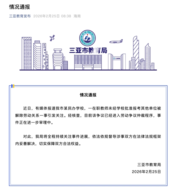 2月24日下午,现代快报记者联系到了三亚市教育局,该局人事科相关工作人员回应,前述情况属实,他们也已关注到此事。据该工作人员介绍,涉事老师于2025年7月入职三亚中学,聘用合同期限为3年,被校方开除后,对方已经申请劳动仲裁。“他们的劳动合同里面已经写到,在合同期限内未经单位允许,不能去报考其他单位,至于这样的约定合理与否,要等劳动部门去裁决。”该工作人员坦言,涉事老师参加的招聘考试未被录取,因三亚中学发现公开的其相关考试成绩信息后,才有了被开除一事。