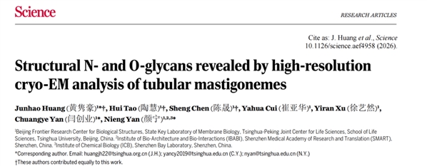 据@深圳医学科学院 微博消息,当地时间2026年4月23日,颜宁、黄隽豪、闫创业等关于糖质结构生物学的一项突破性研究——《高分辨率冷冻电镜解析揭示管状纤绒毛中结构N-和O-糖质》(Structural N- and O-glycans revealed by high-resolution cryo-EM analysis of tubular mastigonemes),正式在国际期刊《科学》(Science)上发表。这项成果为复杂糖质高级结构的发现、鉴定与工程化利用提供了新的方法学框架,标志着糖质结构生物学正进入原子分辨率解析的新阶段。