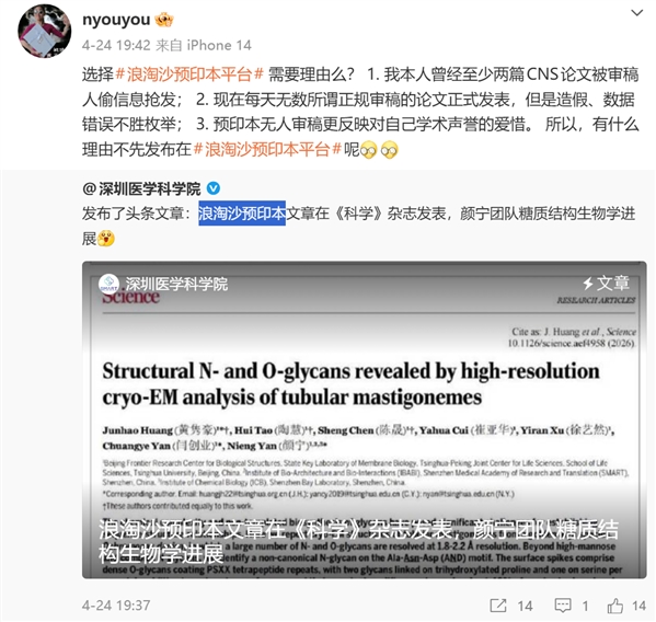 值得注意的是,颜宁院士本人也通过微博转发了上述消息,并表示,“选择浪淘沙预印本平台需要理由么?
