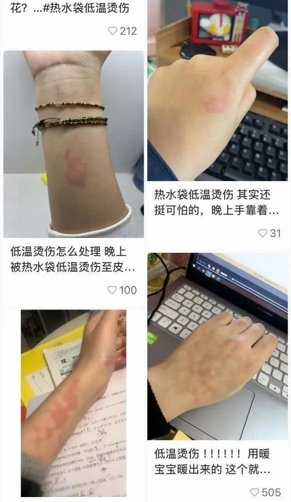 社交平台上部分网友使用取暖用品后的低温烫伤症状