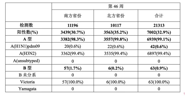 2025年第46周流感样病例监测实验室检测结果。图源:中国疾病预防控制中心病毒病预防控制所