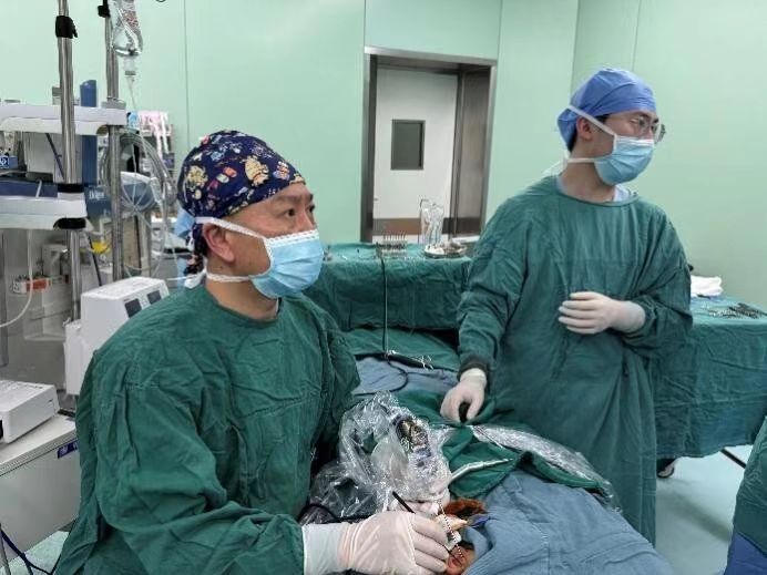 1月9日,浙江大学医学院附属儿童医院手术室内,耳鼻咽喉头颈外科主任付勇正在进行手术。受访者供图
