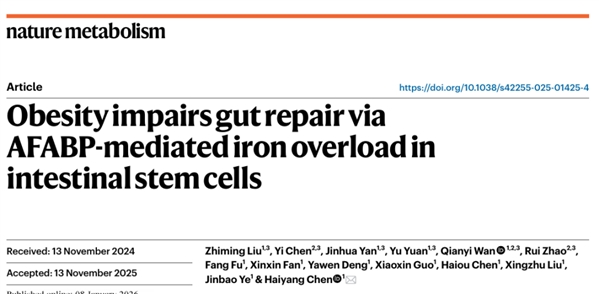 最近,《自然·代谢》期刊发表的一项研究揭开了其中的谜团:肥胖会通过一种名为脂肪细胞型脂肪酸结合蛋白(AFABP)的脂肪因子,干扰肠道干细胞内的铁稳态,从而抑制肠道修复。