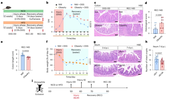 健康状态下,肠道内壁由一层不断更新的上皮细胞构成,而肠道干细胞(ISCs)则是上皮细胞源源不断再生的关键。这些干细胞会分化成多种功能细胞,维持肠道的完整性和功能。然而,研究者在小鼠中发现,高脂饮食诱导的肥胖小鼠在经历结肠炎后,肠道修复能力明显减弱。在恢复期第14天,肥胖小鼠表现出更严重的组织损伤和更短的结肠长度。