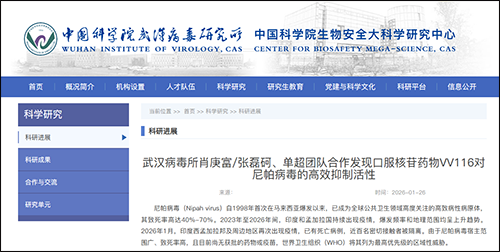中国科学院武汉病毒研究所网站1月26日消息,武汉病毒所肖庚富/张磊砢、单超团队合作发现口服核苷药物VV116对尼帕病毒的高效抑制活性。全文如下: