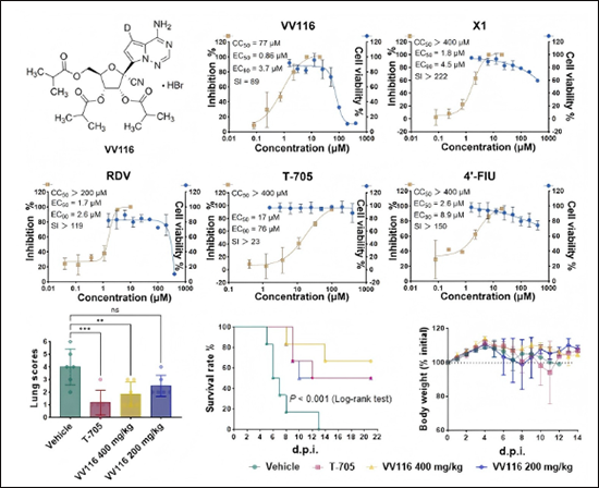 VV116(氢溴酸氘瑞米德韦片)是一种新型口服核苷类抗病毒药物,已先后在乌兹别克斯坦和中国获批上市用于新冠肺炎的治疗。本研究发现,作为一种靶向病毒RNA依赖性RNA聚合酶(RdRp)的前药,体外实验中VV116和其代谢活性分子均展示了对尼帕病毒(包括马来西亚株NiV-M和孟加拉株NiV-B)的显著抑制活性。在金黄地鼠致死剂量感染模型中,VV116以400毫克每千克体重的口服给药剂量下,能将实验动物的存活率提高至66.7%,且显著降低感染靶器官肺、脾和脑中的病毒载量。