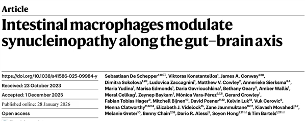 参考资料:[1] De Schepper, S., Konstantellos, V., Conway, J.A. et al. Intestinal macrophages modulate synucleinopathy along the gut–brain axis. Nature (2026). https://doi.org/10.1038/s41586-025-09984-y