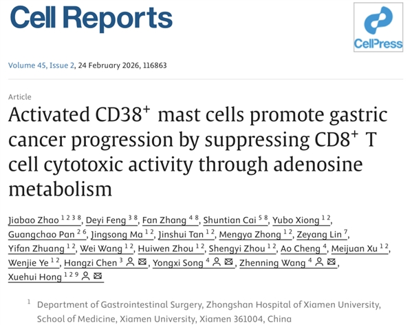 Zhao, Jiabao, et al. "Activated CD38+ mast cells promote gastric cancer progression by suppressing CD8+ T cell cytotoxic activity through adenosine metabolism." Cell Reports45.2 (2026): 116863.