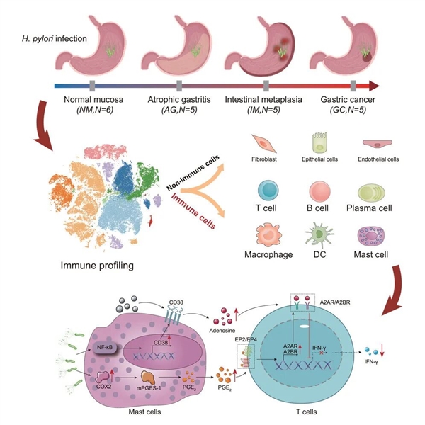 近日,厦门大学附属中山医院胃肠外科团队在《细胞报告》(Cell Reports)发表重磅研究成果,首次通过单细胞测序技术全景解析幽门螺杆菌(H. pylori)感染驱动胃癌(GC)进展的免疫微环境动态变化。研究发现,H. pylori感染可激活CD38+肥大细胞,通过分泌腺苷和前列腺素E2(PGE2)协同抑制CD8+ T细胞功能,为胃癌免疫治疗提供了全新靶点。