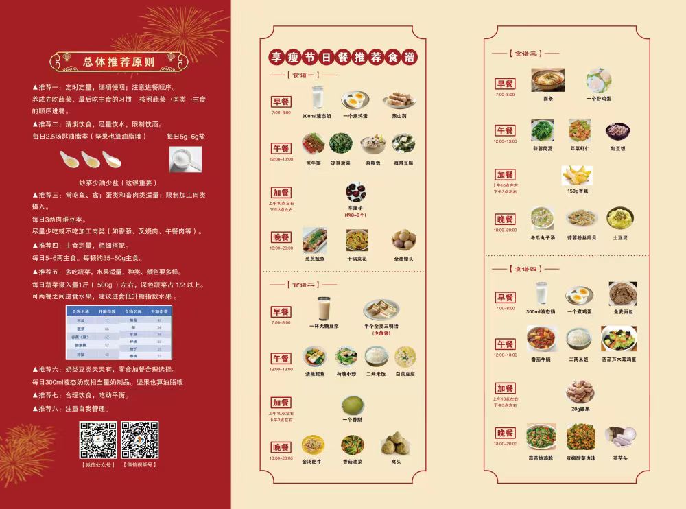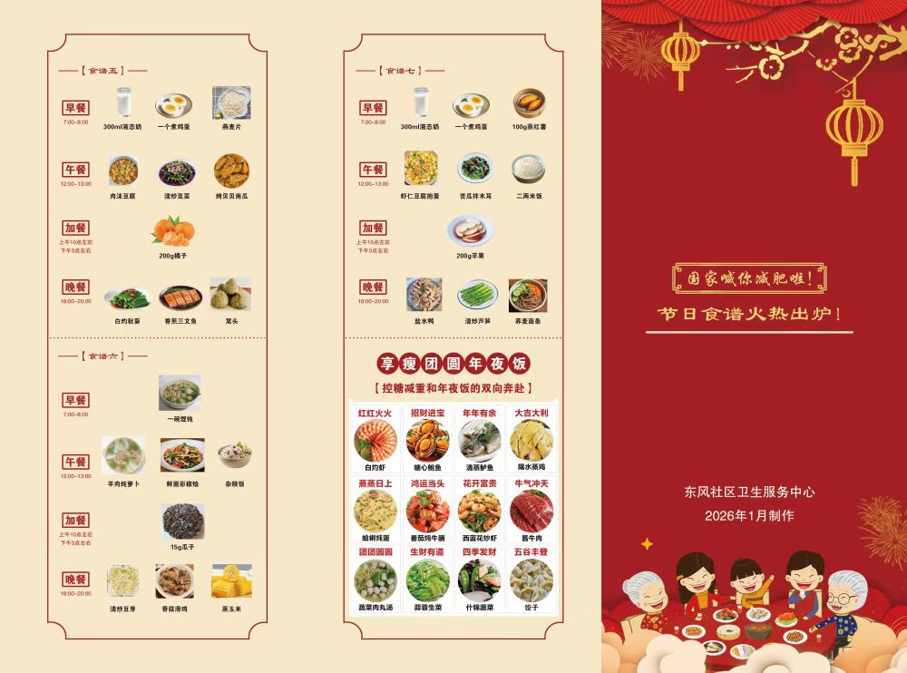 如今,在东风社区卫生服务中心前台,总是备着一叠红色的“节日食谱”宣传单。里面图文并茂,提供节假日期间的饮食建议,包括三餐建议和健康团圆饭菜品推荐。