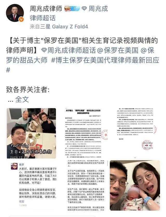 (人民日报健康客户端记者 高瑞瑞)2月12日晚,千万粉丝博主“保罗在美国”(本名保罗)就此前发布妻子生产过程视频所引发的巨大争议,通过其委托的 @周兆成律师 发布律师声明,正式作出回应并致歉。