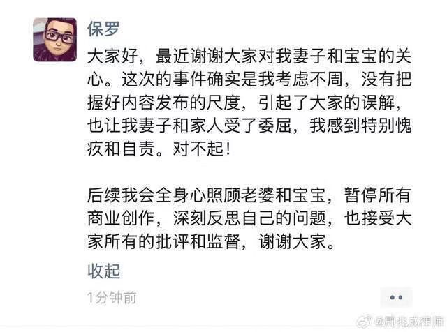 根据律师声明,保罗承认在内容发布尺度的把握上考虑不周,并向因此受到影响的家人和公众致歉;强调视频拍摄系夫妻共同意愿,且发布前经妻子亲自审核,对于网传的“漠视伴侣意愿”“表演式陪伴”等说法予以否认;表示产后拍摄均在医生评估、妻子主动参与下进行。声明发布后,保罗表示决定暂别创作,专注妻子产后休养及新生儿照料。
