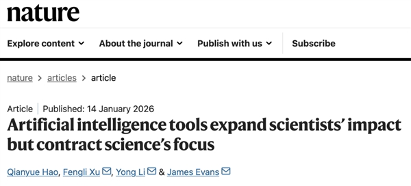 2026 年 1 月 14 日,清华大学电子工程系李勇教授、徐丰力助理教授联合芝加哥大学 James Evans 教授(清华大学郝千越为论文第一作者),在国际顶尖学术期刊 Nature 上发表了题为:Artificial intelligence tools expand scientists’ impact but contract science’s focus 的研究论文。