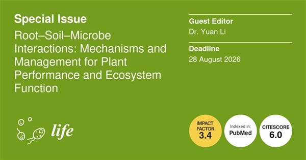 Life邀请了陕西师范大学地理科学与旅游学院的李元博士,创建特刊 Root–Soil–Microbe Interactions: Mechanisms and Management for Plant Performance and Ecosystem Function(根系 - 土壤 - 微生物互作:植物性能与生态系统功能的机制及管理)。本期特刊诚邀原创研究、综述和简讯投稿,旨在增进对植物根系、土壤和微生物群落之间相互作用及其对植物生长和生态系统功能影响的理解。投稿内容可涵盖栽培植物和野生植物,研究尺度从分子过程到景观动态均可接受,并应提供机制性见解或可靠的证据,以指导管理、保护或预测。我们欢迎涵盖生态学、微生物学、土壤学、植物生理学和环境管理等领域的跨学科研究。稿件应清晰阐述研究假设、方法以及对植物生长或生态系统功能的影响。