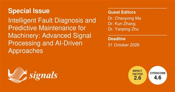 Signals 邀请了北京工业大学马朝永老师、张坤老师以及朱艳萍老师,合作创建特刊Intelligent Fault Diagnosis and Predictive Maintenance for Machinery: Advanced Signal Processing and AI-Driven Approaches(机械智能故障诊断与预测性维护:先进的信号处理与人工智能驱动方法)。本特刊旨在汇集全球学者在智能故障诊断与预测性维护领域的最新突破性研究,聚焦算法创新、跨领域融合和工程应用,推动该领域向更高精度、更强泛化能力和更高可解释性发展,并为工业智能化提供坚实的技术基础。潜在的研究主题包括但不限于以下内容:基于数字孪生的故障演化仿真和寿命预测;深度学习和大模型在机械健康管理中的创新应用;边缘智能和轻量级诊断算法;可解释人工智能与故障物理机制的融合;多模态融合和跨域感知智能;小样本、零样本和开放集故障诊断;智能运行维护系统和闭环决策;先进的信号处理和自适应特征工程。